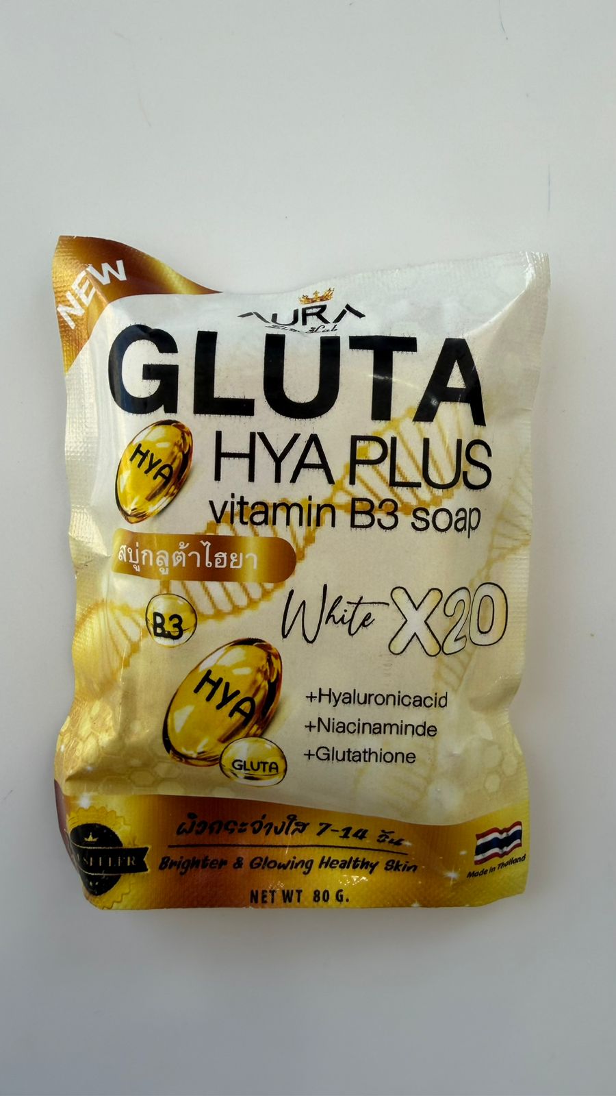 صابون جلوتا هاي بلس وفيتامين B3 من لوري (AURA Gluta Hya Plus Vitamin B3 Soap). هو منتج تايلاندي مخصص للعناية بالبشرة، صُمم بتركيبة “White X20” المتقدمة التي تهدف إلى تفتيح البشرة ومنحها مظهراً صحياً ومشرقاً.
