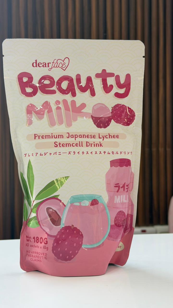 مشروب بيوتي ميلك بالليتشي من دير فيس (Dear Face Beauty Milk Premium Japanese Lychee Swiss Stemcell Drink). هو مكمل غذائي ياباني فاخر يهدف إلى تحسين الصحة والجمال من الداخل عبر تقنية الخلايا الجذعية.