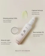 الجينسنغ، وهو مكون رئيسي من BOJ وHanbang ثبتت فعاليته من خلال العديد من الدراسات، كعنصر رئيسي. الصابونين، الوفير في مستخلص الجينسنغ، له تأثير مضاد للشيخوخة، ويساعد على تحسين التجاعيد، ويوفر التغذية للبشرة.