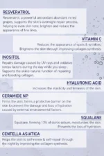 حمض الهيالورنيك , سيراميدات , باكوتشيول (مشتق من الريتينول) , فيتامين سي , سكوالان . خالي من العطور .