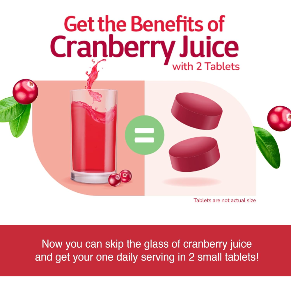 فوائد عصير التوت البري في شكل أقراص: توفر حبتان من حبوب التوت البري لدينا فوائد تعادل كوبًا واحدًا من عصير التوت البري*، مما يجعلها إضافة بسيطة إلى روتينك اليومي لدعم صحة المثانة بشكل فعال