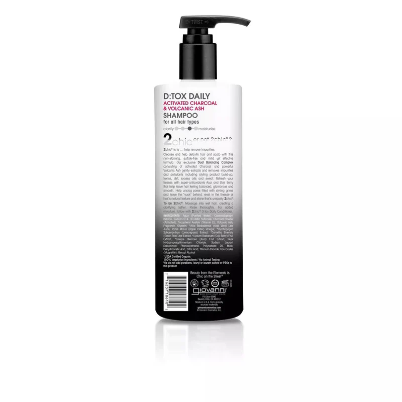 يعيد بلسم جيوفاني 2 شيك دي: توكس اليومي للشعر ذلك الشعور المنعش بالنظافة والترطيب مع مزيج فعال للعناية بالشعر لا يسبب البقع مع مركب التوازن المزدوج الحصري من جيوفاني والذي يتكون من الفحم النشط والرماد البركاني القوي. يستخرج بلطف ويزيل الشوائب والملوثات بما في ذلك تراكم منتجات التصفيف، وزهم فروة الرأس، والسموم، والأوساخ، والزيوت الزائدة والعرق. يجدد الشعر بمضادات الأكسدة الفائقة أساي وتوت غوجي، مما يجعل الشعر متوازنًا وبراقًا وناعمًا.