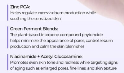تركيبة للعناية بالمسام تحتوي على الزنك PCA، ومزيج الخميرة الخضراء، والنياسيناميد، وأسيتيل الجلوكوزامين، التي تتضافر للمساعدة في التحكم في إفراز الدهون، وتهدئة البشرة المتهيجة، وتقليل ظهور المسام الواسعة، وتحسين ملمس البشرة بشكل عام.