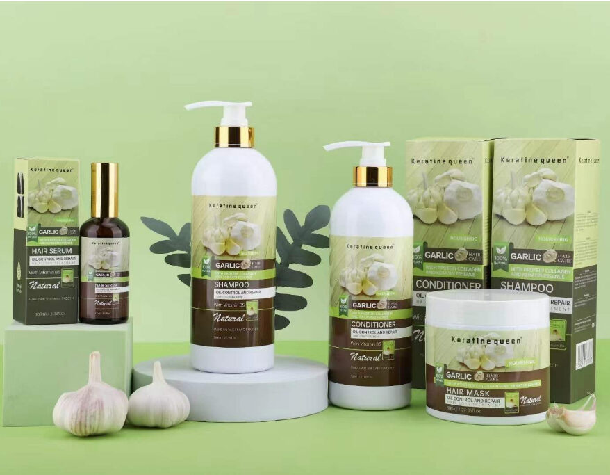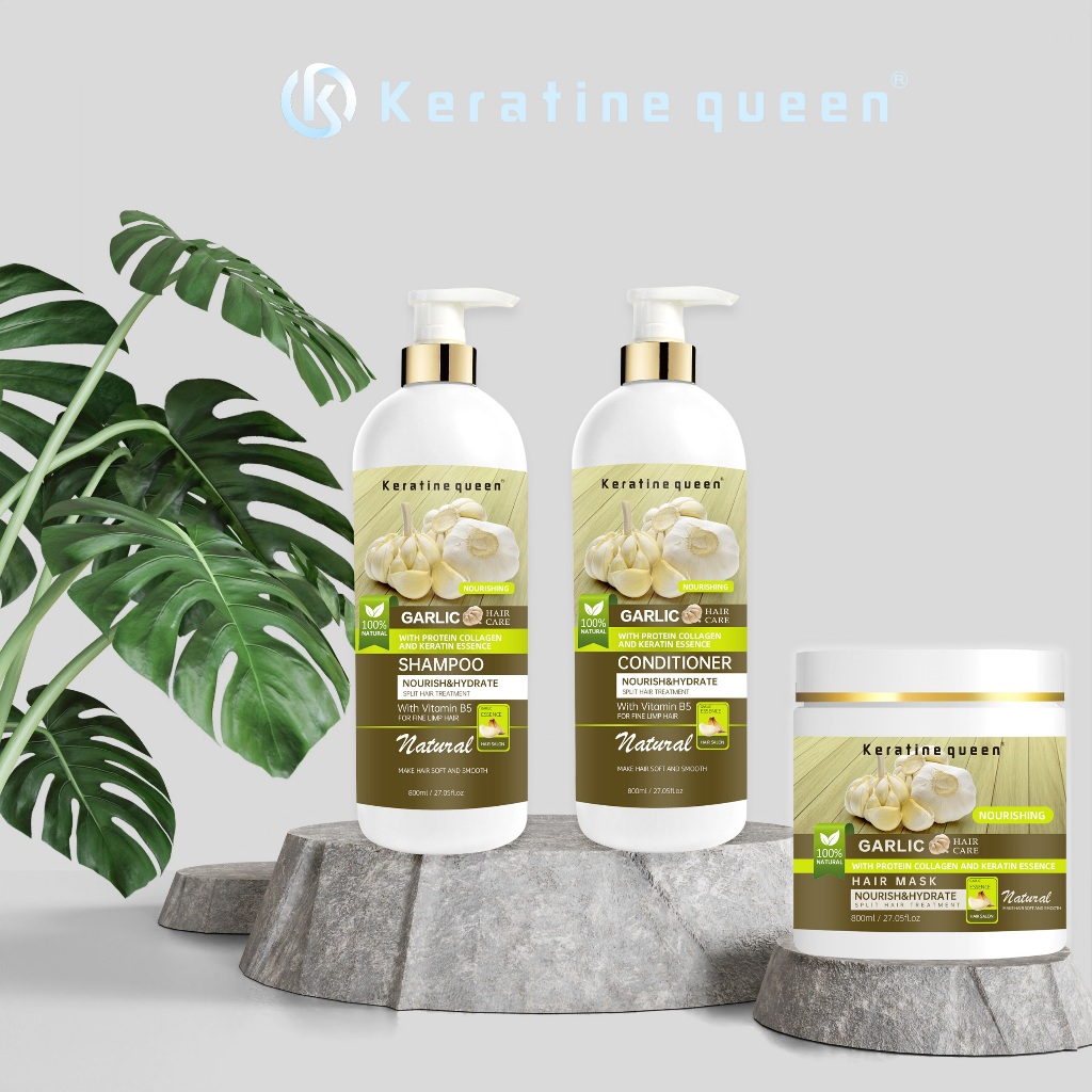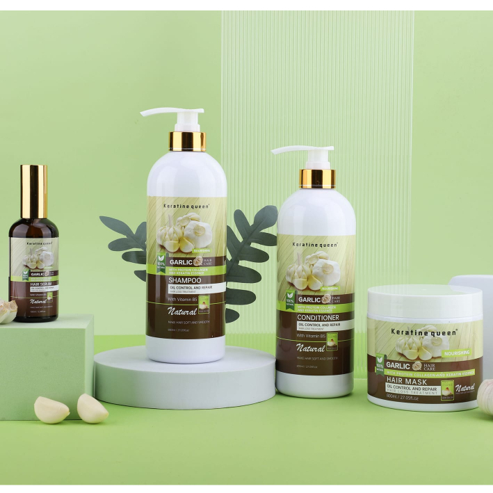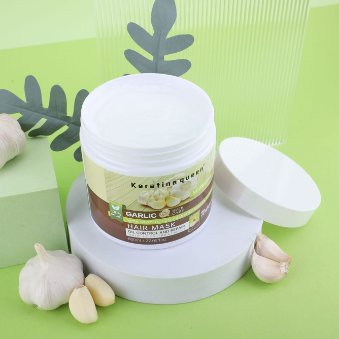 يحتوي الثوم على مكونات غذائية جيدة، حيث يوفر العديد من العناصر الغذائية للشعر ويدمر بكتيريا العفن – السبب وراء تساقط الشعر ويسبب قشرة الرأس المزعجة للغاية. يحتوي فيتامين ب5 الموجود في الثوم على تركيبة مختلفة عن فيتامين ب5 العادي الموجود في الخضروات الأخرى. لأنه يحتوي على أحماض اللوتين أحادية الصوديوم واللوتين ثنائية الصوديوم، والتي تعتبر محفزات لزيادة عملية التحويل إلى البروتينات الضرورية. وبذلك يصبح الشعر أقوى دون أن يصبح دهنيًا، مما يحد من تساقط الشعر.