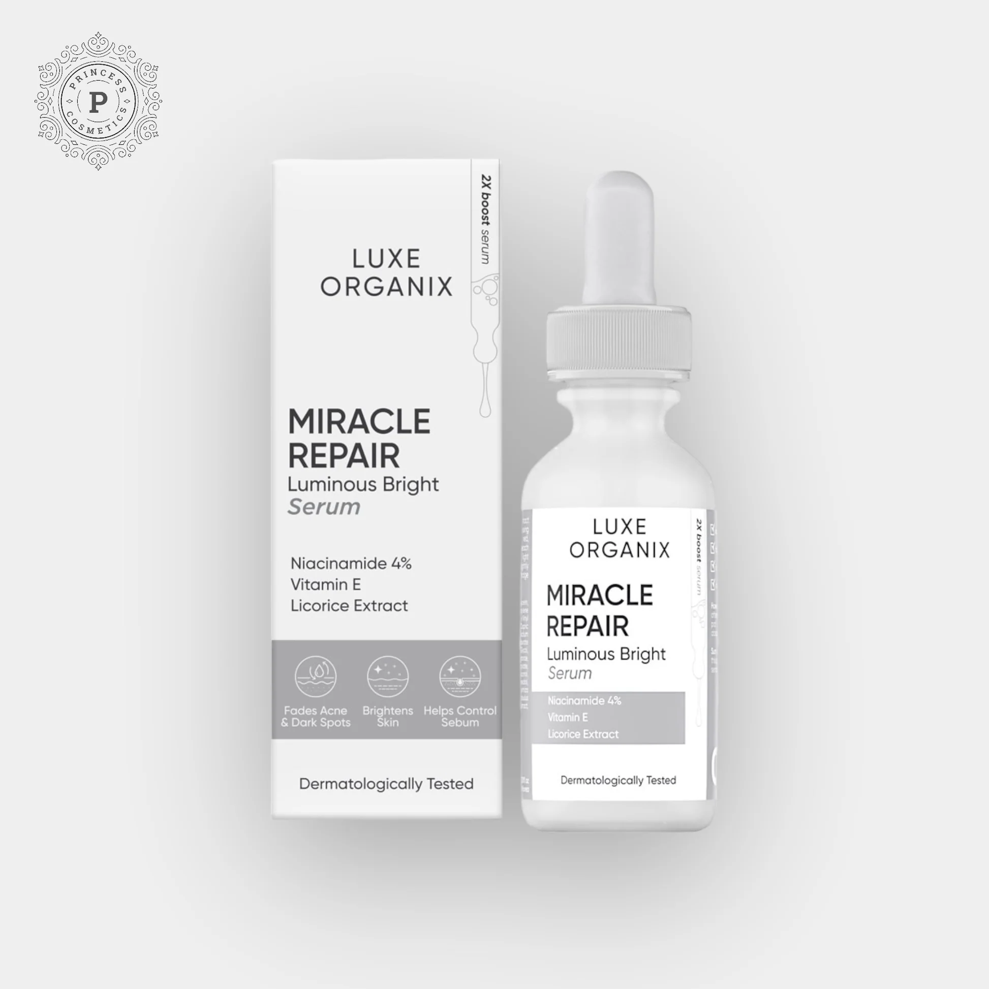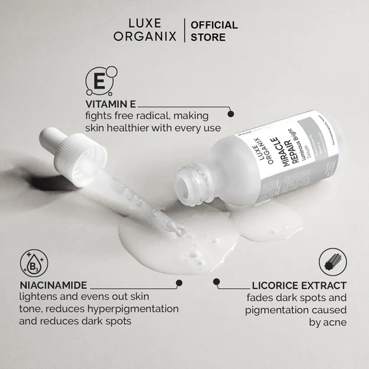 يحتوي مصل Luxe Organix Mirale Repair Luminous Bright على مستخلصات النياسيناميد وعرق السوس التي تساعد على التخلص من البقع الداكنة والتصبغ الناتج عن حب الشباب مع زيادة إنتاج الكولاجين للمساعدة في تحسين حاجز البشرة. مع الفوائد القوية لفيتامين E لمحاربة الجذور الحرة، تصبح البشرة أكثر صحة مع كل استخدام.