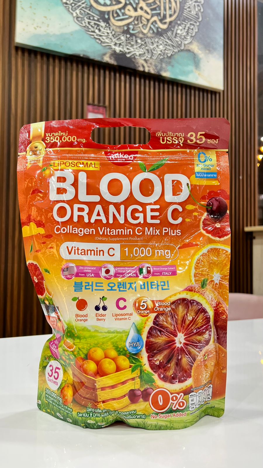 مكمل غذائي تايلاندي يُسمى ميكو بلود أورانج سي كولاجين (Mikeo Blood Orange C Collagen)، وهو عبارة عن مسحوق يُخلط مع الماء للعناية بالبشرة والصحة العامة