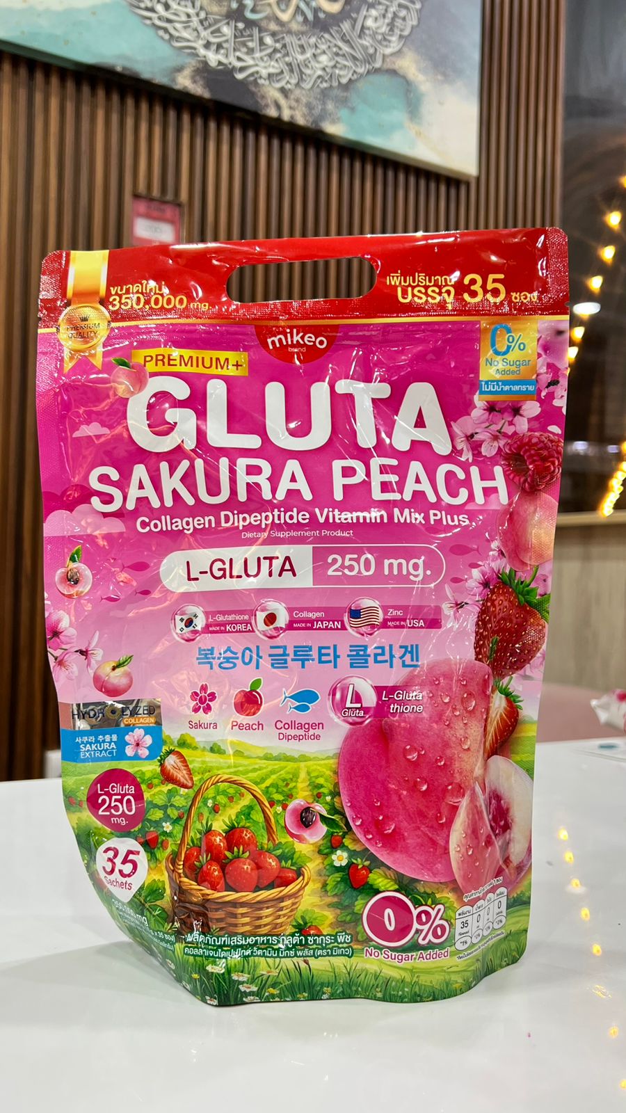 مكمل غذائي تايلاندي يُعرف باسم ميكو جلوتا ساكورا بيتش (Mikeo Gluta Sakura Peach Collagen Dipeptide Vitamin Mix Plus). وهو مشروب تجميلي مصمم لدعم نضارة البشرة وترطيبها وصحتها العامة من الداخل.