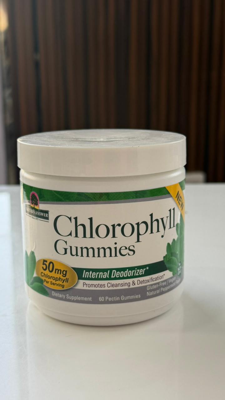 علكات الكلوروفيل من ماركة نيتشرز آنسر (Nature’s Answer Chlorophyll Gummies). وهو مكمل غذائي طبيعي مصمم لدعم عمليات التنظيف الداخلي للجسم وتعزيز الصحة العامة في شكل حلوى بكتين لذيذة.