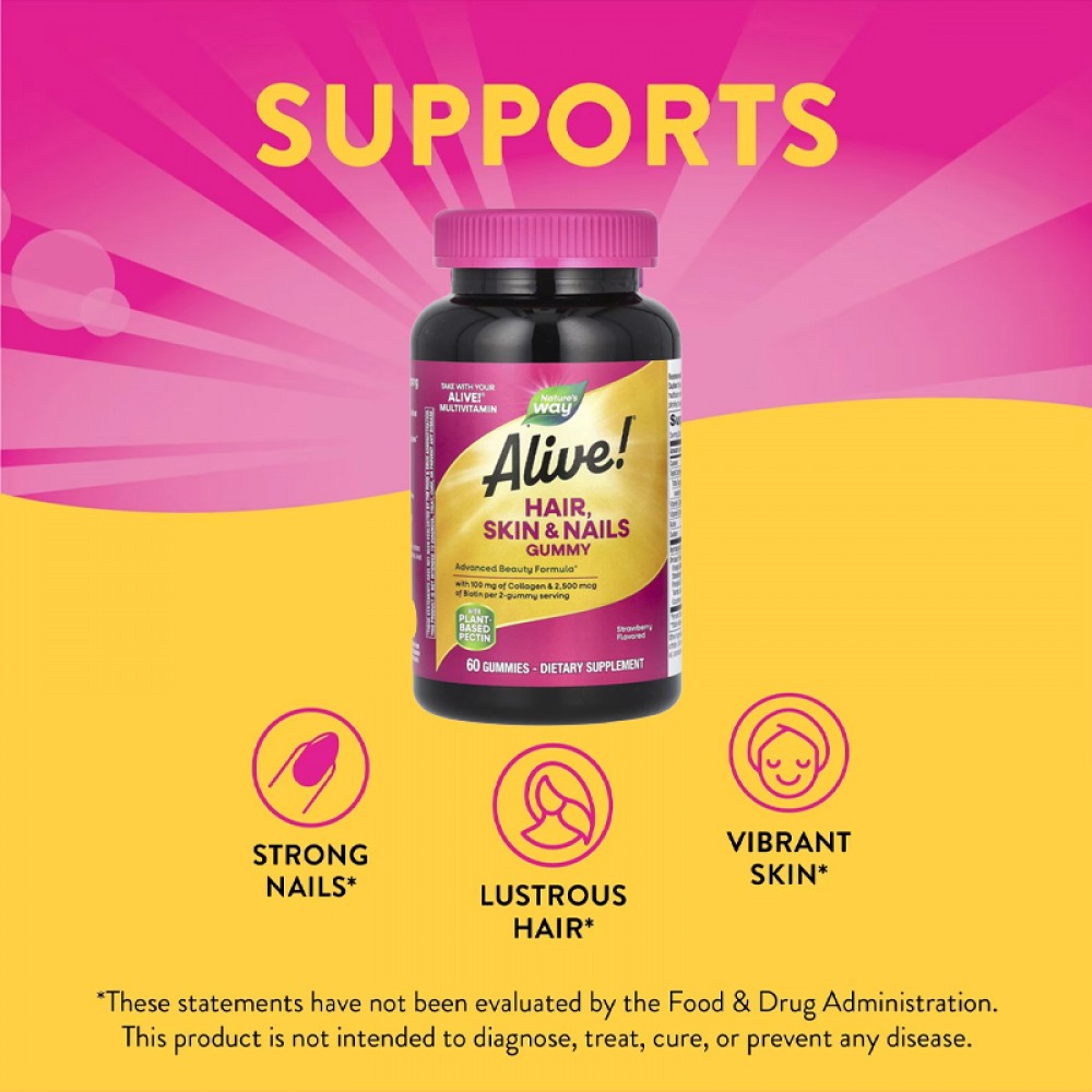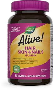 - تعد علكات Nature’s Way Alive! للشعر والبشرة والأظافر تركيبة متطورة للجمال لدعم الشعر اللامع والبشرة الصحية والأظافر القوية.* تناولها مع الفيتامينات المتعددة من Alive!
