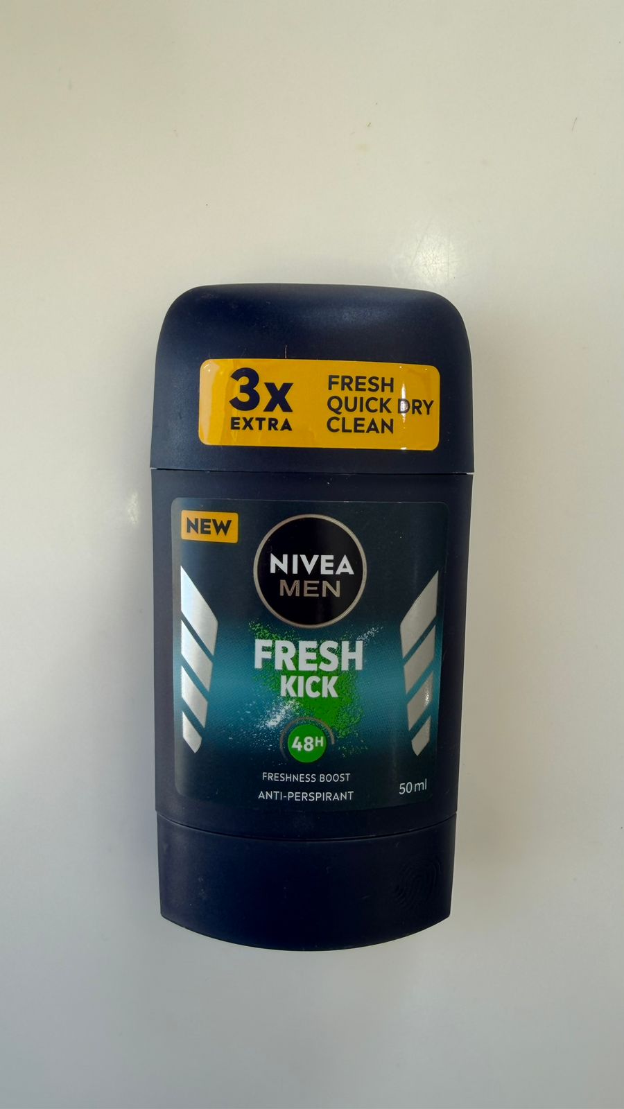مضاد للتعرق نيفيا للرجال فريش كيك (Nivea Men Fresh Kick Anti-Perspirant). يأتي هذا المنتج في شكل ستيك (Stick) بحجم 50 مل، وهو مصمم خصيصاً لتوفير شعور فوري بالانتعاش وحماية طويلة الأمد.