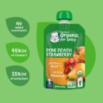 طعام الأطفال العضوي بالكمثرى والخوخ والفراولة من Gerber 2nd Foods عبارة عن هريس فواكه عضوي لذيذ يجعل وقت التغذية سهلاً. مصنوع من فواكه عضوية تلبي معايير الجودة العالية من Gerber، تتضمن وصفة طعام الأطفال غير المعدلة وراثيًا من Gerber للمرحلة 2 1/3 كمثرى و1/8 خوخ و3/4 فراولة في كل كيس لمزيج شهي غير محلى ولا يحتوي على ألوان أو نكهات صناعية أو نشا مضاف.