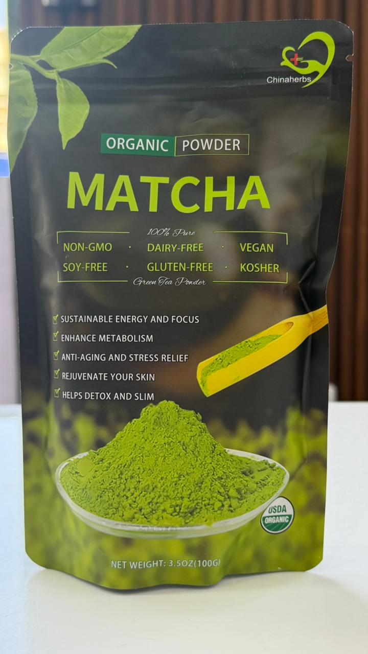 مسحوق شاي الماتشا الأخضر العضوي (Organic Matcha Powder) من إنتاج شركة تشاينا هيربس (Chinaherbs). وهو عبارة عن شاي أخضر مطحون نقي بنسبة 100%، يشتهر بكونه “غذاءً فائقاً” (Superfood) نظراً لفوائده الصحية المتعددة.