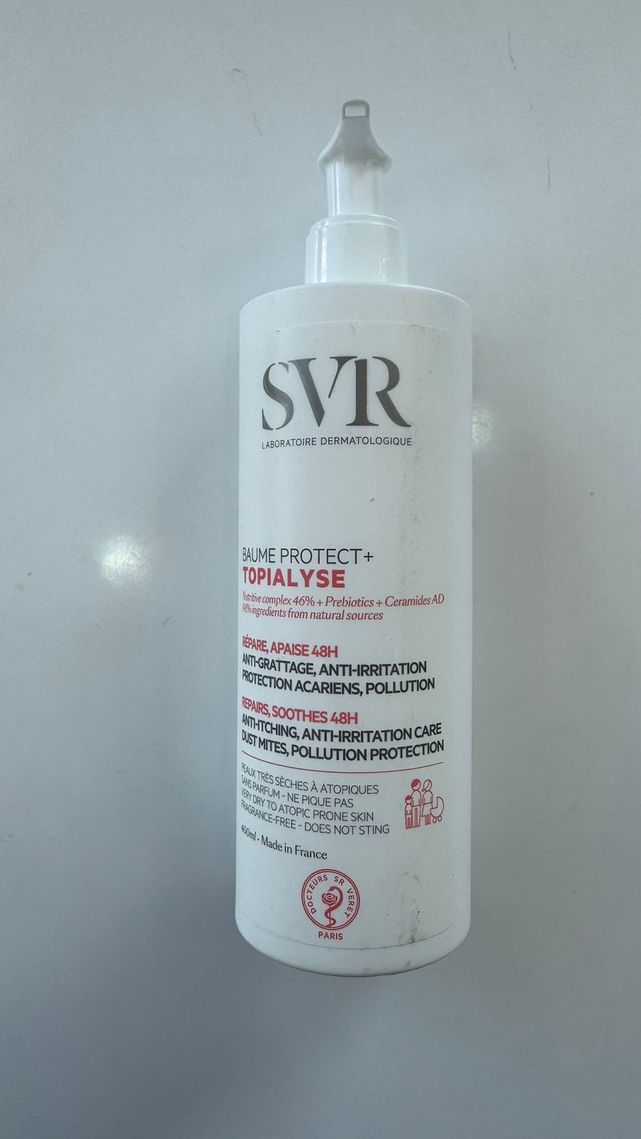 توبياليس بلسم بروتكت بلس من مختبرات إس في آر (SVR Topialyse Baume Protect+). وهو بلسم مرمّم مخصص للعناية المكثفة بالبشرة شديدة الجفاف والمصابة بالحساسية أو الأكزيما.