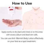 لوشن جسم مميز يساعد على تقليل الدهون الزائدة والقضاء على البثور من خلال تقشير البشرة باستخدام مكونات AHA وBHA وكالامين. يمكن استخدامه على أي منطقة من الجسم، ولكنه مثالي للمناطق المعرضة للبثور مثل الظهر والصدر.