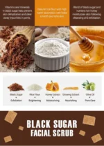 - يزيل مقشر الوجه بالسكر الأسود خلايا الكيراتين القديمة والزهم، وينظف سطح الجلد، ويفتح المسام، ويحفز الدورة الدموية مع توفير العناصر الغذائية والرطوبة للبشرة.