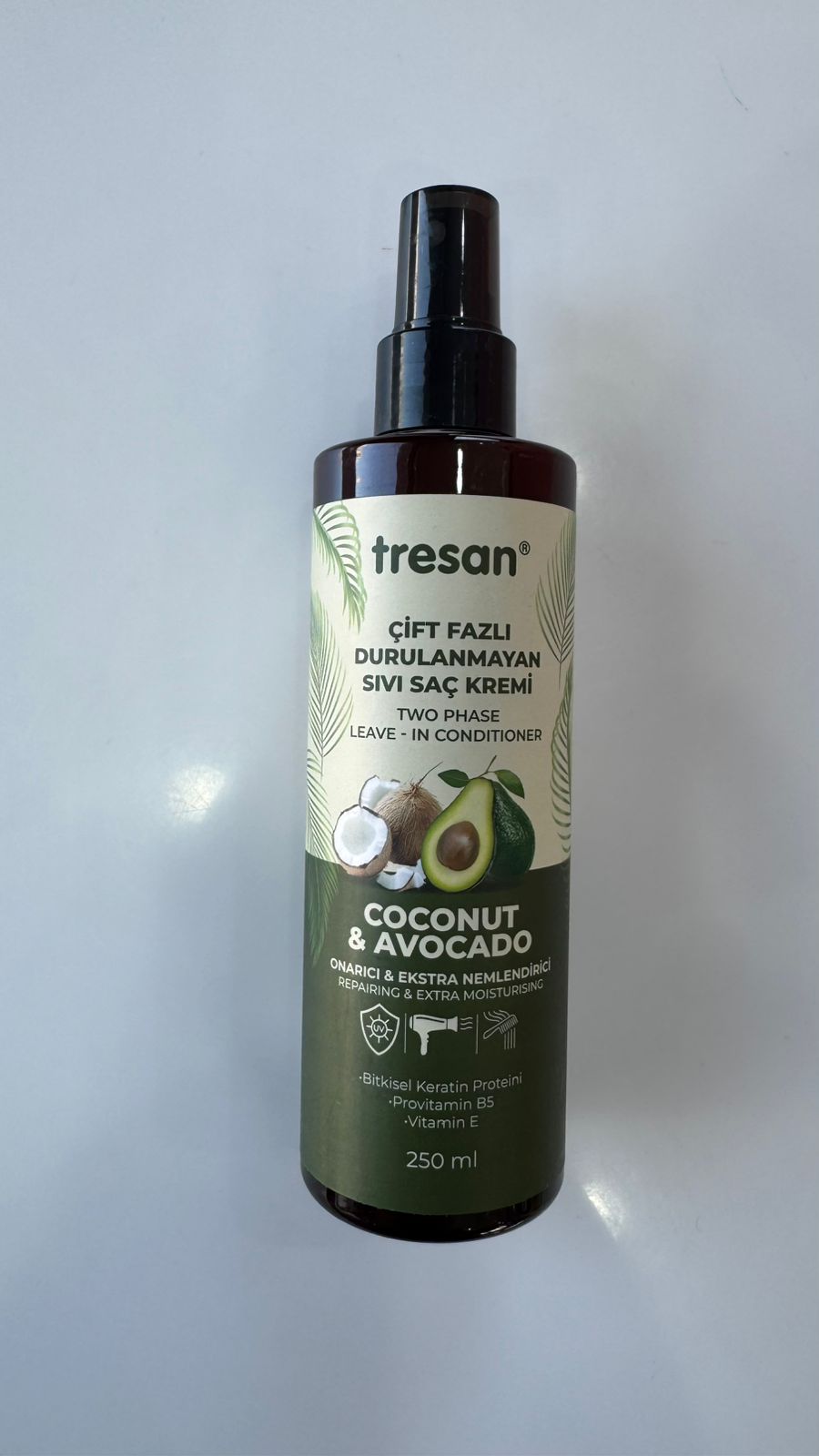 منعم للشعر بجوز الهند والأفوكادو (Tresan Coconut & Avocado Two Phase Leave-In Conditioner). وهو منعم سائل “ثنائي الطور” يُترك على الشعر ولا يُشطف، مخصص لتوفير رعاية مكثفة وحماية للشعر.